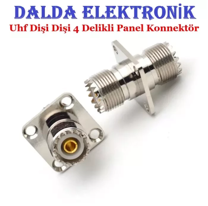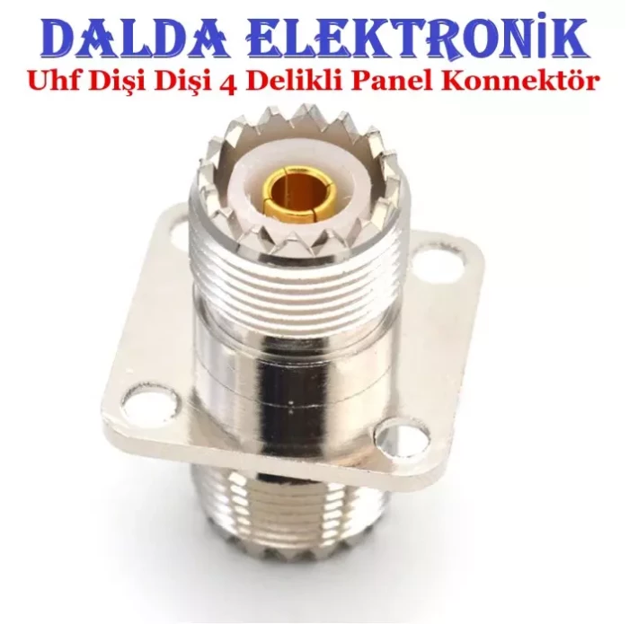 Uhf Dişi Dişi 4 Delikli Panel Konnektör, Aslen uçak sanayi ve titreşimin çok önemli ve hassas olduğu füze uygulamaları için geliştirilmiştir. konnektörleri boyut olarak konnektörlerin minyatürü boyutundadır fakat birleştirme somunu sayesinde Kaliteli bir performansa sahiptir.Dayanıklılığı ve güvenilirliği tercih sebebi olmuş ve ağırlıklı olarak iletişim endüstrisinde kullanılmaktadır. Altın kaplama kontak pin ve nikel kaplama gövde sayesinde sinyal kaybını en aza indirir.